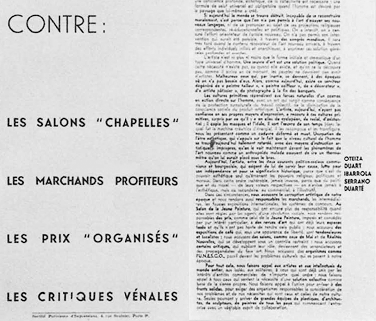 Cuando en nombre de una libertad plástica, de un arte nuevo, se nos presenta un panorama deformado, equívoco, impuesto por circunstancias comerciales, políticas, religiosas, que han relegado al intelectual y al artista fuera de la vida, nosotros nos alzamos con la historia, con los días aún cálidos de las últimas revoluciones plásticas contra las maniobras monopolísticas de los marchantes y de las galerías de arte, contra los organismos oficiales destinados a la instrucción pública como los museos, los cuales regidos por el gusto particular de sus directores son transformados en panteones de la curiosidad turística. Porque cuando las posibilidades de las artes plásticas estallan de vitalidad, la desorientación y las lamentaciones más pesimistas se propagan en Europa, desorientación y lamentaciones de un arte endiosado, kandinskiano, evasivo y personalista; porque cuando los acontecimientos mundiales nos conducen a fundamentos comunes universales, la crisis sobrevive con un carácter general, invadiendo todas nuestras actividades tanto como hombres que como artistas.